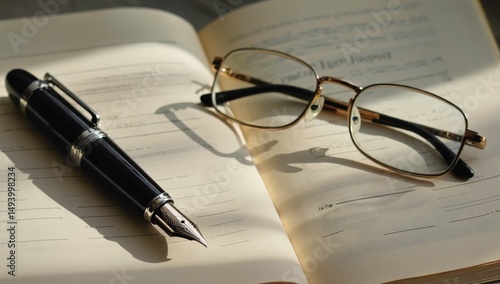 A black fountain pen and eyeglasses rest on an open notebook in warm sunlight, representing classic writing, thoughtful reading, and intellectual focus in a scholarly or literary environment study.