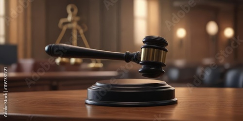 A black gavel rests on a wooden pedestal in a dimly lit courtroom, darkness, judicial, stone floor
