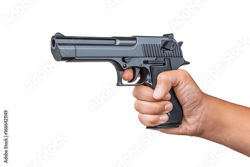 A black handgun held in the left hand, stock photo style