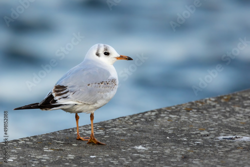 A black headed gull at a beach in the north of Denmark at a windy day in spring