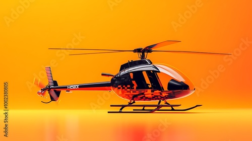 A black helicopter with a red stripe on the side sits on the ground with a yellow background.