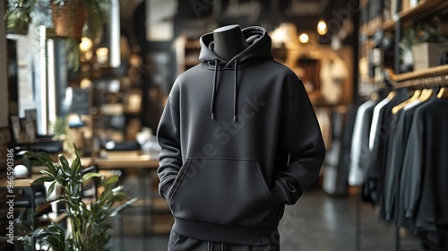 A black hoodie with a drawstring on a mannequin in a clothing store.