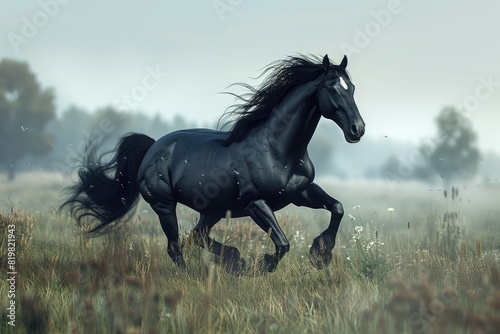 A black horse galloping through a field of tall grass. Perfect for nature and animal themes