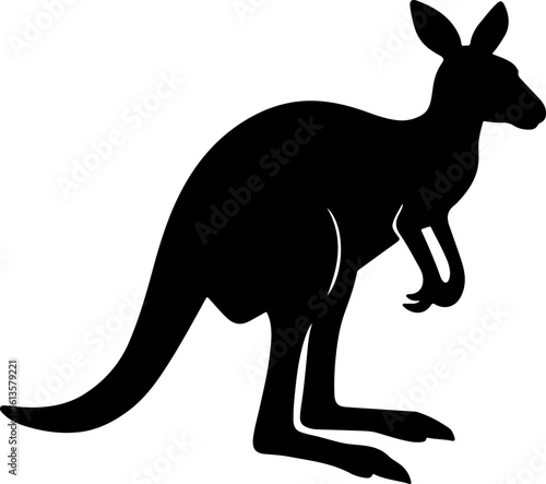 A black kangaroo silhouette standing upright with its tail extended backwards on a white background