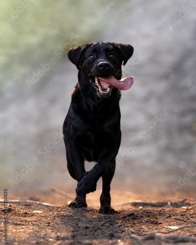 A black Labrador runs towards. Labrador runs. The black dog runs his tongue out