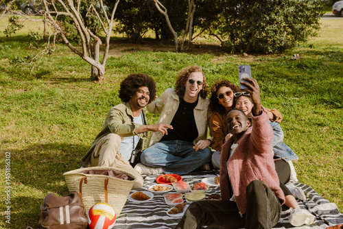 A Black man in his 20s taking a selfie with a multiethnic, group of young adult friends while they are sitting on a blanket scattered on the grass in a park during a picnic with plates of various food