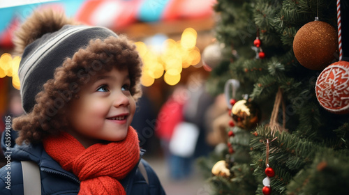 A black mixed race boy toddler standing in front of and looking at a christmas tree christmas market christmas decorations christmas lights snow white christmas joy