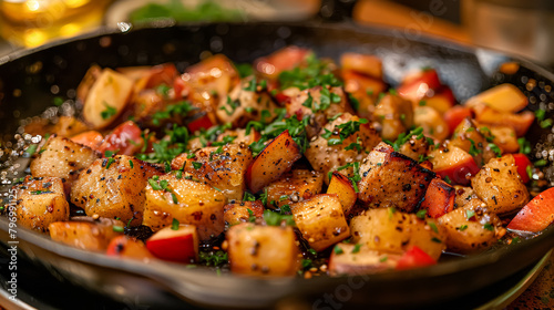 A black pan filled with potatoes and other vegetables. The food is steaming and looks delicious. The pan is on a wooden table