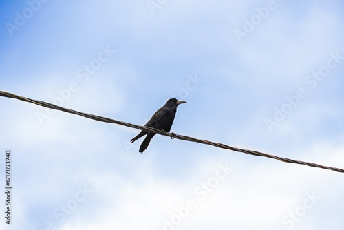 A black raven sits on a wire against a blue sky. Raven on an isolated background