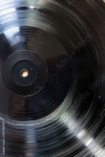 A black record with a hole in the center. The record is old and worn. Concept of nostalgia and the passage of time