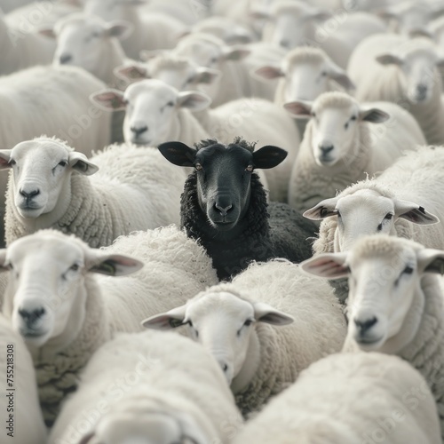 A black sheep among a flock of white sheep. Hold your head up confidently It is a symbol of uniqueness. and stand out from the crowd. It represents the idea of being different and having unique qualit