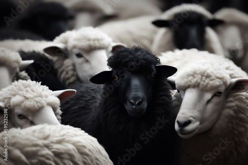 A black sheep in the herd surrounded of white sheeps with the concept of be outstanding or unique. Generative AI.