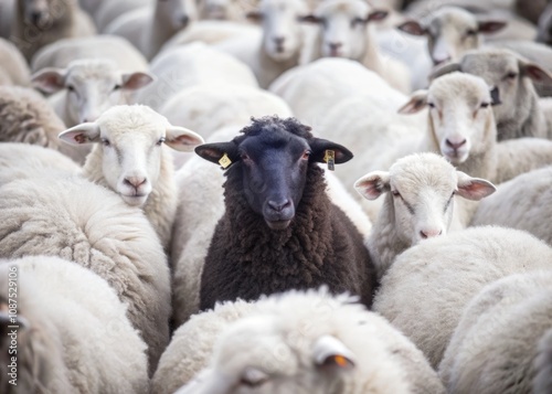 A Black Sheep Standing Alone Among a Crowd of White Sheep, Symbolizing Solitude and Individuality in Nature's Harmony