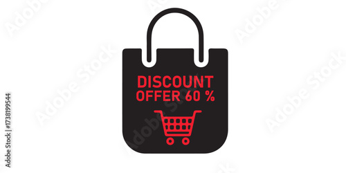 A black shopping bag with red text advertising a discount offer and a red shopping cart icon below.