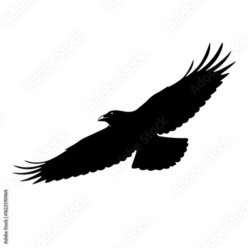 A black silhouette of a eagle bird, in flight with its wings spread wide against a plain white background.