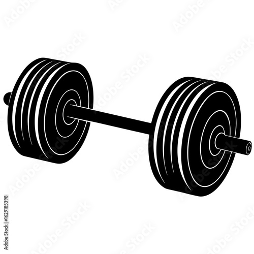 A black silhouette of a weighted barbell with multiple plates on each side on a white background