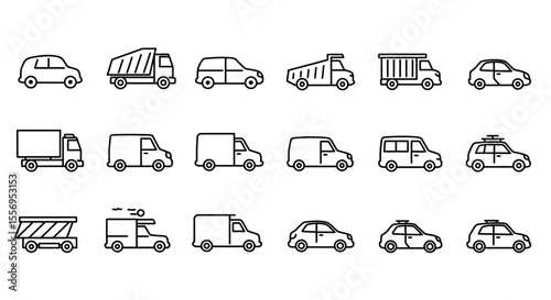 A black silhouette set of construction and transportation vehicle icons including car, truck, bus, and van illustrations
