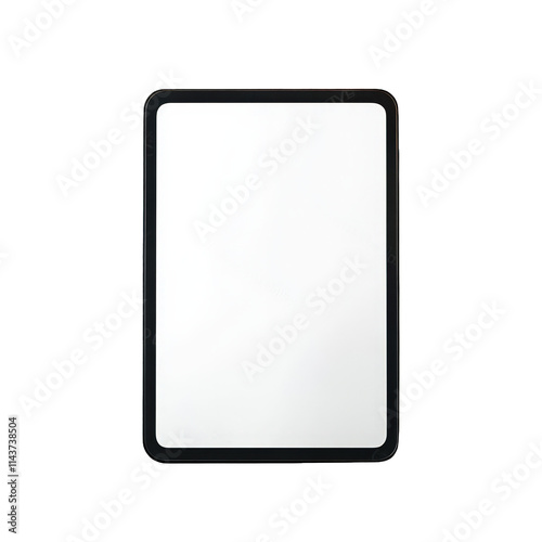 a black tablet with a blank white screen stands upright on a concrete floor against a textured concrete wall