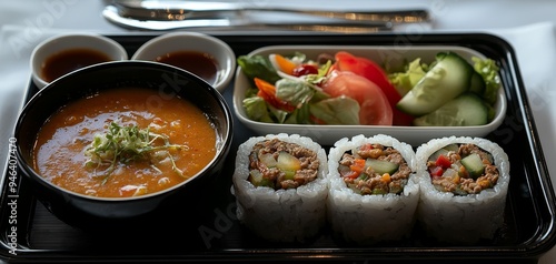 A Black Tray of Asian Cuisine Closeup of a bowl of soup with green onion garnish three sushi rolls and a side salad all set on a black tray