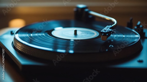 A black vinyl record spinning on a turntable, with soft light casting shadows around it.