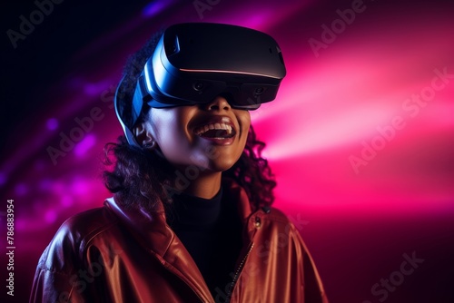 A black woman in a pink magenta theme shirt is presenting the new modern designed virtual reality glasses as a commercial advertising on her head with a friendly smile. Generative AI.