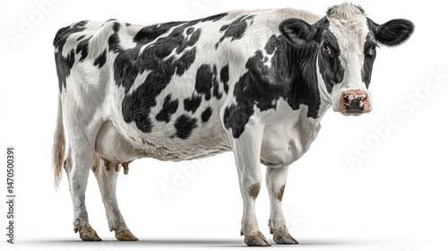 A black-and-white cow standing proudly, isolated on a white background