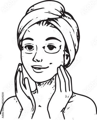 A black-and-white sketch of a woman with a towel on her head, applying cream to her face with closed eyes, perfect for skincare, beauty, and relaxation-themed designs