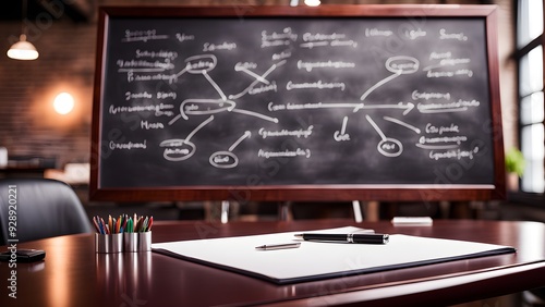A blackboard with a diagram on it and a pen and pencils on a desk