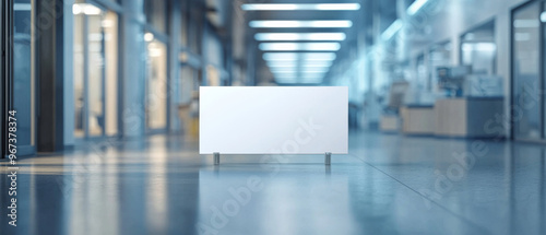 A blank advertising sign stands prominently in modern corridor, showcasing clean white screen mockup. sleek design and spacious environment create professional atmosphere