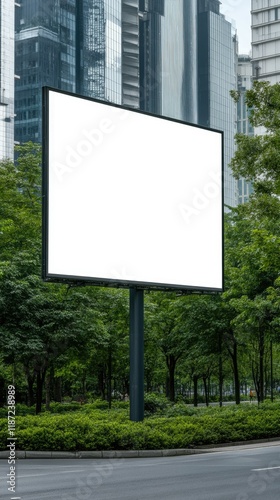 A blank billboard stands amidst lush trees in a city, offering a space for potential outdoor advertisements and promotions