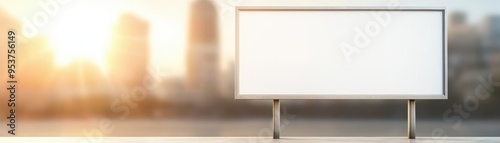 A blank billboard stands in the foreground against a sunrise, perfect for advertising or promotional visuals in urban settings.