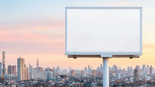 A blank billboard stands prominently against a city skyline at sunset, offering a canvas for advertisements and messages.