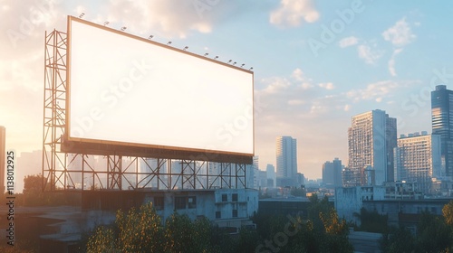 A blank billboard stands tall against a vibrant city skyline during sunset, symbolizing opportunities for creativity.