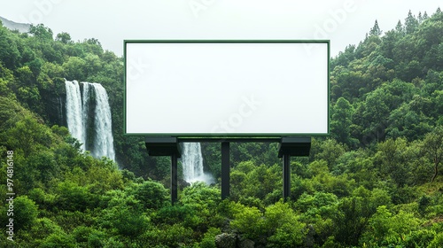 A blank billboard surrounded by lush greenery and waterfalls, perfect for showcasing advertisements in a serene environment.