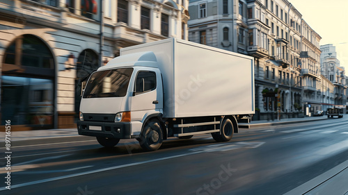 A Blank Canvas on Wheels: A Delivery Truck Rolls Through the City Streets on a Sunny Afternoon