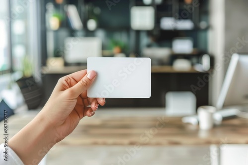 A blank credit card mockup held by a hand, with a financial office setting behind