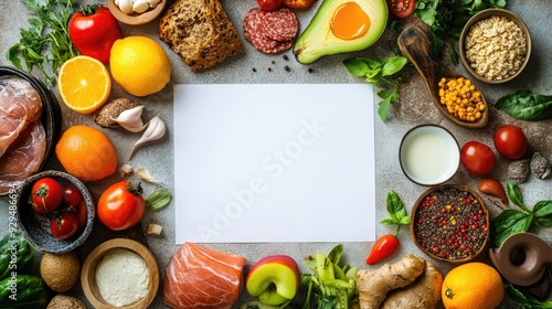 A blank meal plan sheet with healthy food items around, with space for text or logos.