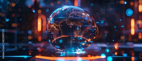 A blank podium showcase featuring a glowing neon blue padlock surrounded by a complex network of digital circuits