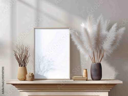 A blank poster frame on top of an elegant shelf in a mockup style with boho vibes decor blueish cold hues The color palette is beige and white with bohemian