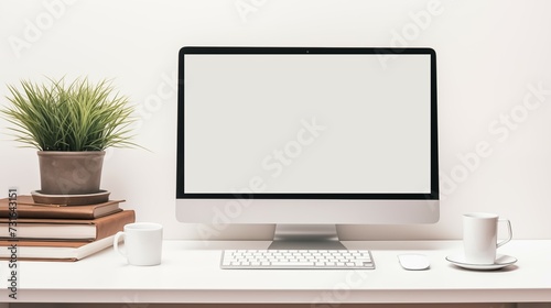 A blank screen on desktop computer on a white desk.