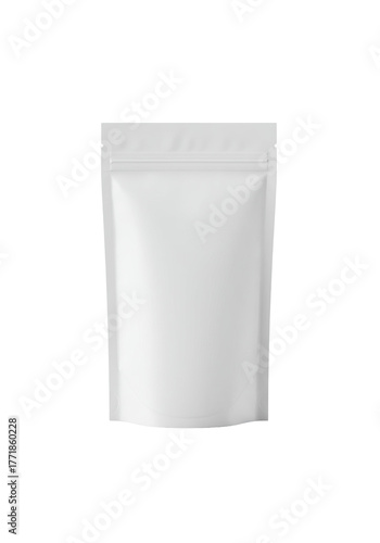A blank unbranded white matte Doypack stand-up pouch with zipper seal and rounded corners, empty, on a pure transparent background with soft reflection, concept for product packaging advertising