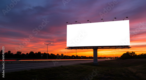 A blank white billboard for advertising mockups stands beside a highway during a vibrant sunset.