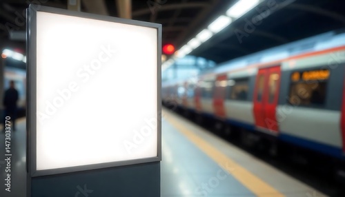 A blank white billboard on a train platform with a blurred train in the background created with generative ai