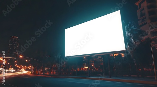 A blank white billboard poster illuminated at night, set against a dark city street.