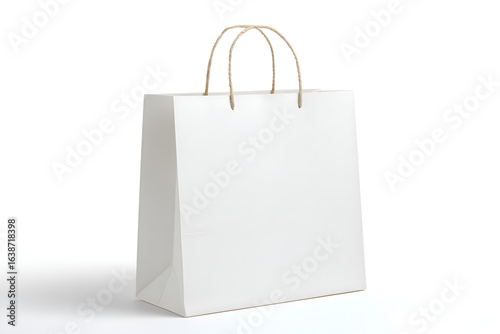 A blank white paper shopping bag with natural rope handles sits on a white background