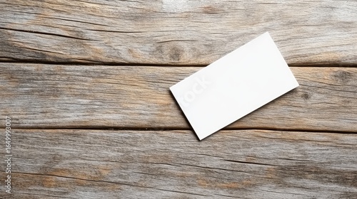 A blank white rectangular card rests diagonally on a rustic, weathered wooden surface composed of parallel planks showing varied grain and tones of gray, brown, and beige
