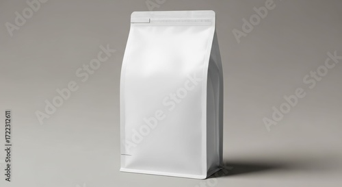 A blank, white, sealed, rectangular pouch standing upright on a neutral gray background.