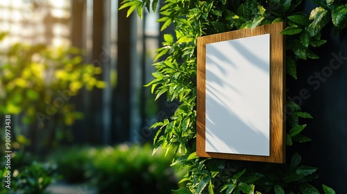 A blank wooden frame against a lush green wall, capturing the beauty of nature and modern design in harmony.