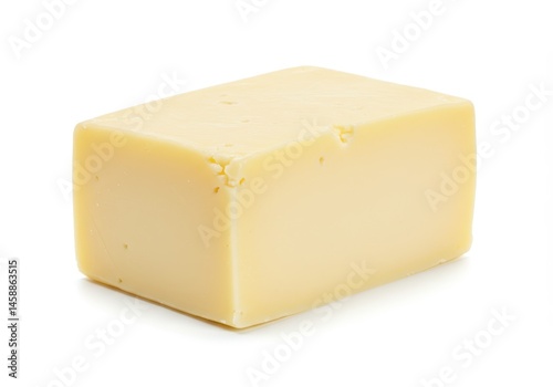 A block of cheddar cheese sits on a white surface, casting a soft shadow in the studio light