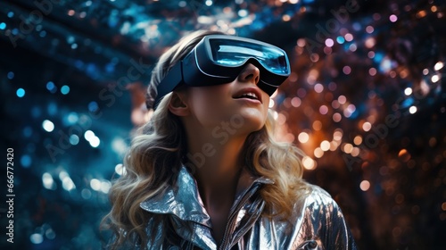 A blond long hair woman wearing reality glasses explores the expanses of space.
